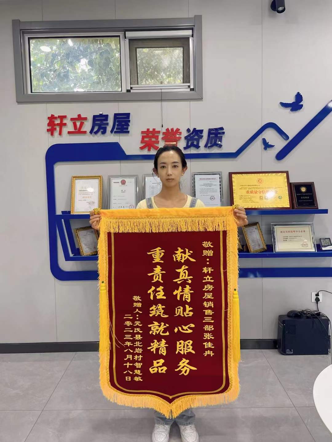 8月21號軒立業(yè)務(wù)經(jīng)理張佳冉收到了來自石家莊市元氏縣北巖村業(yè)主智慧敏先生送來的致謝錦旗,表達(dá)了業(yè)主對業(yè)務(wù)經(jīng)理張佳冉工作態(tài)度和優(yōu)質(zhì)服務(wù)的肯定和感謝。