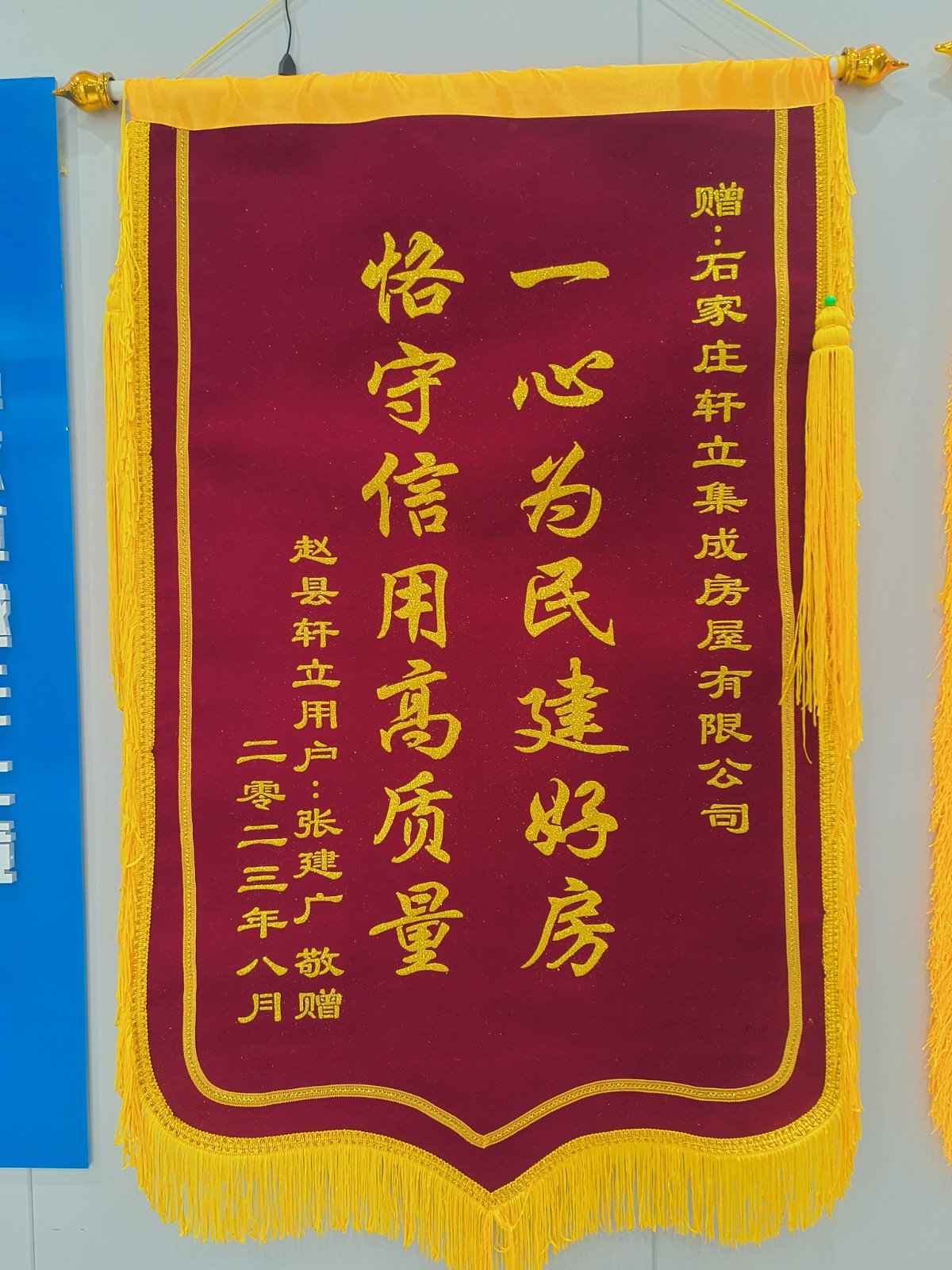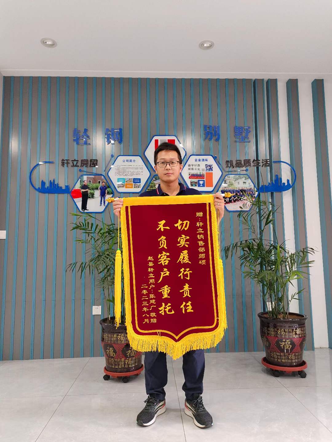 8月28日,對于軒立來說又是一個(gè)特殊的日子。今天,軒立收到了來自石家莊趙縣前大章鄉(xiāng)后大章村業(yè)主張建廣先生贈送的三面錦旗,給予“一心為民建好房,恪守信用高質(zhì)量”“工作忠于職守,做事認(rèn)真負(fù)責(zé)”“切實(shí)履行責(zé)任,不負(fù)客戶重托”的高度評價(jià),是對業(yè)務(wù)經(jīng)理師碩、項(xiàng)目經(jīng)理劉學(xué)良工作認(rèn)真負(fù)責(zé)的高度贊揚(yáng),也是業(yè)主張先生對石家莊軒立集成房屋有限公司的匠心品質(zhì)的信任與肯定,以及對我們所有員工的一份認(rèn)可與鼓勵。